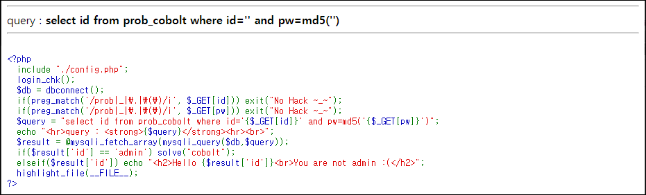 필터링을 사용하지 않거나 우회하여 쿼리 결과 값의 id가 admin면 해결