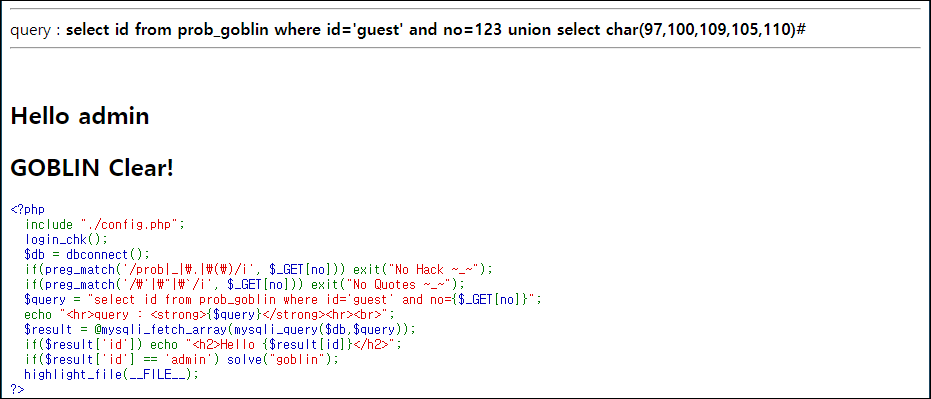 필터링을 사용하지 않거나 우회하여 쿼리 결과 id가 admin이면 해결