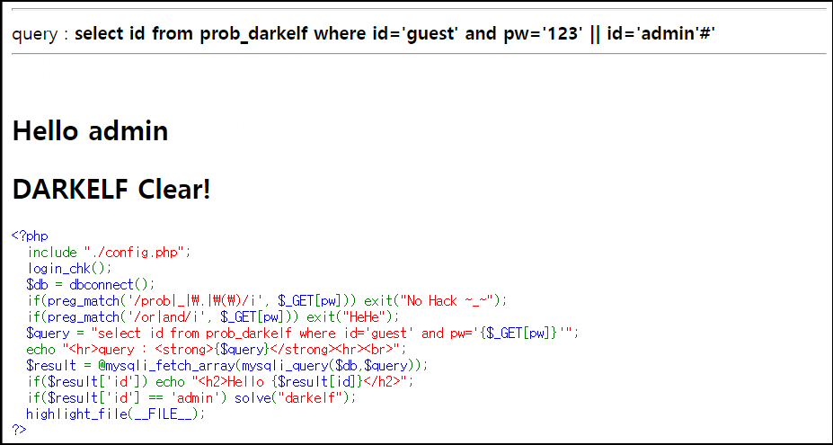 필터링을 사용하지 않거나 우회하여 쿼리 결과 id가 admin이면 해결