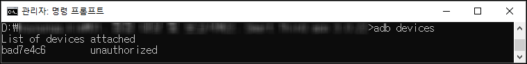 "adb devices" 명령어로 현재 연결된 device를 확인해보면 unauthorized 라고 표기된다. (원랜 device)