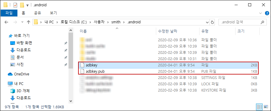 4. PC 아래 경로에서 "adbkey" 파일 제거 ※ C:\Users\[현재사용자]\.android