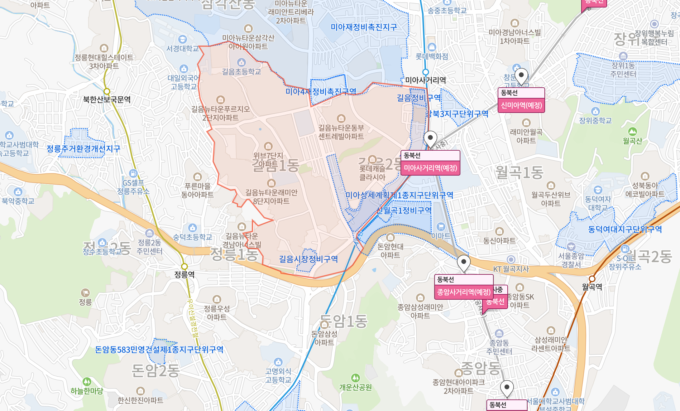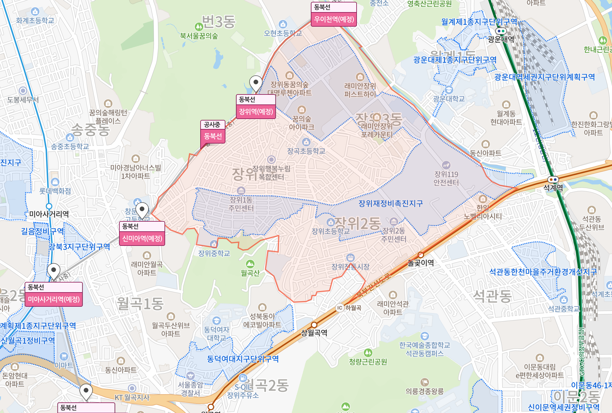 순서대로 1급지 ~ 3급지 순으로 인근 호재에 대한 스크린샷을 담았다. 2급지는 그 자체가 장위재정비 촉진지구 개발이 진행 중이다. 나머지는 인근에서 계속 개발 중이기에 일부 매매가에 영향을 받을 수 있다. 또, 2026년 개통 예정인 동북선(왕십리 ↔ 상계)이 진행 중이다. 동북선은 3급지를 제외한 1, 2급지가 직접적으로 영향을 받게 될 것으로 보인다. 2급지의 경우 위 교통 분석에서 가장 좋지 못한 면모를 보였으나, 동북선이 이를 해소해줄 수 있는 강력한 요소가 될 것 같다. 다만 2026년으로 예상이지, 확정이 아니기 때문에 더 길어질 수 있다는 부분은 인지해야한다.