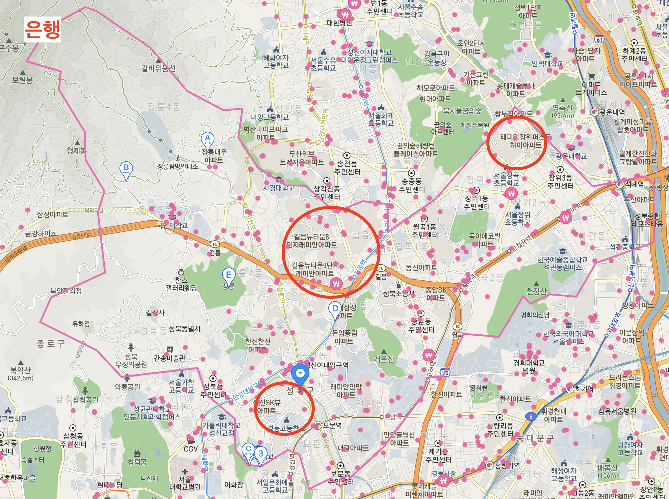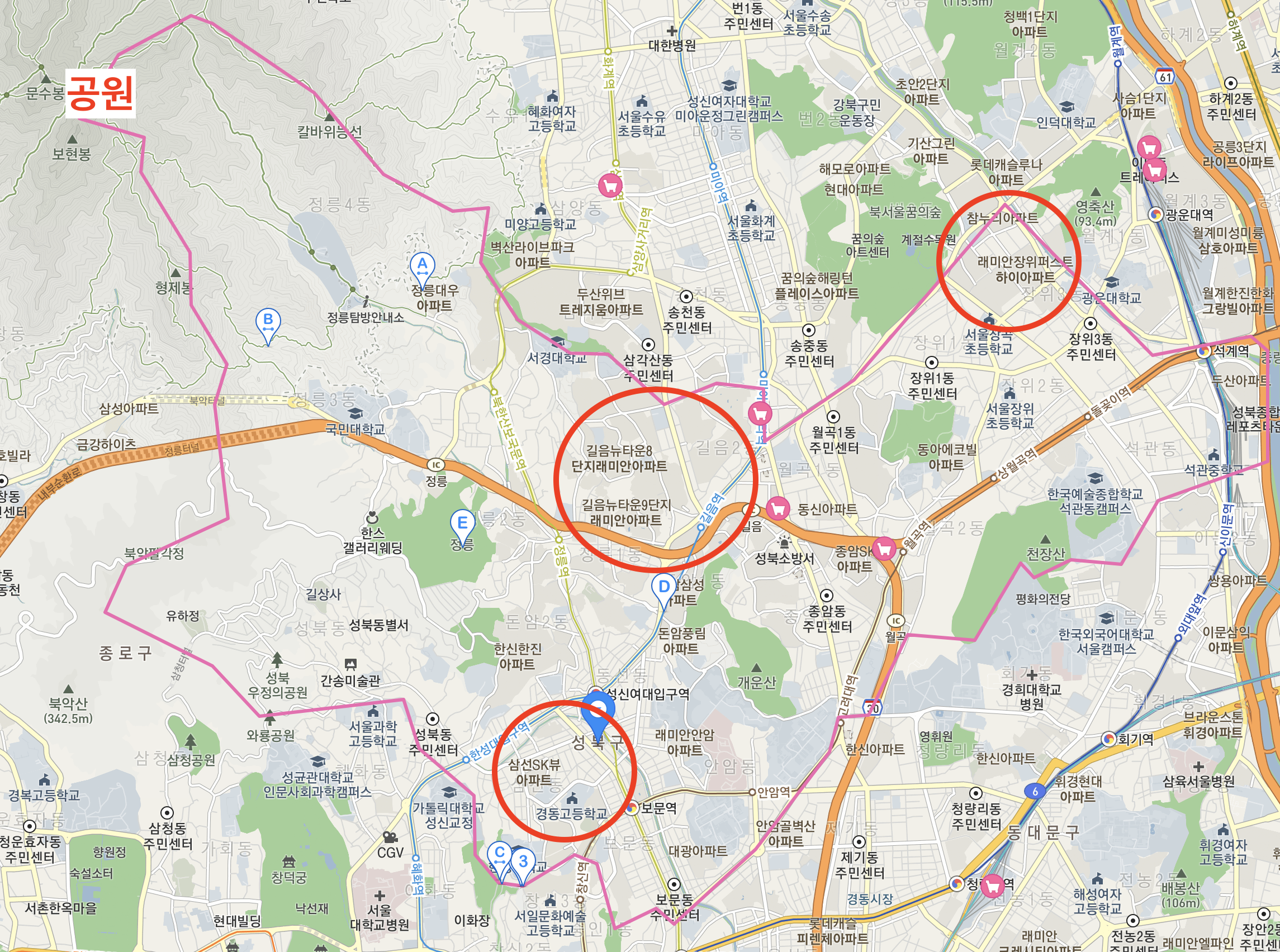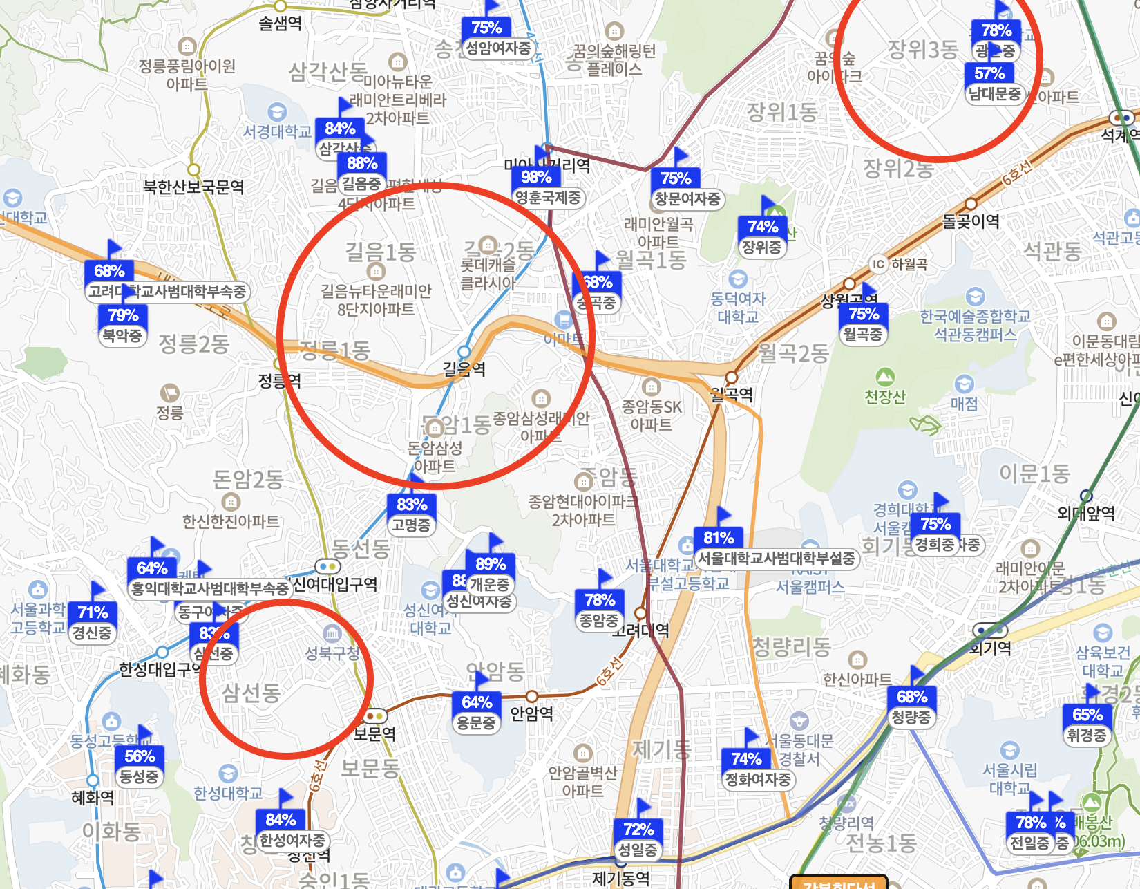 성북구에 대해 분석을 진행하다 보니, 1급지 → 3급지 → 2급지 순으로 입지가 좋은 것 같다는 생각이 들었다. 1, 3급지는 심지어 인근에 2개 노선이 위치해 있고 직통 버스들이 있어서 교통이 매우 유리했으며, 3급지는 대형 상권 및 학원가가 매우 인접하여 자녀를 키우기도 좋을 것 같다. 학업 성취도율도 높은 중, 고등학교 역시 1, 3급지에 몰려있었다는 부분 또한 2급지 입지를 더 안좋게 만드는 부분이다.