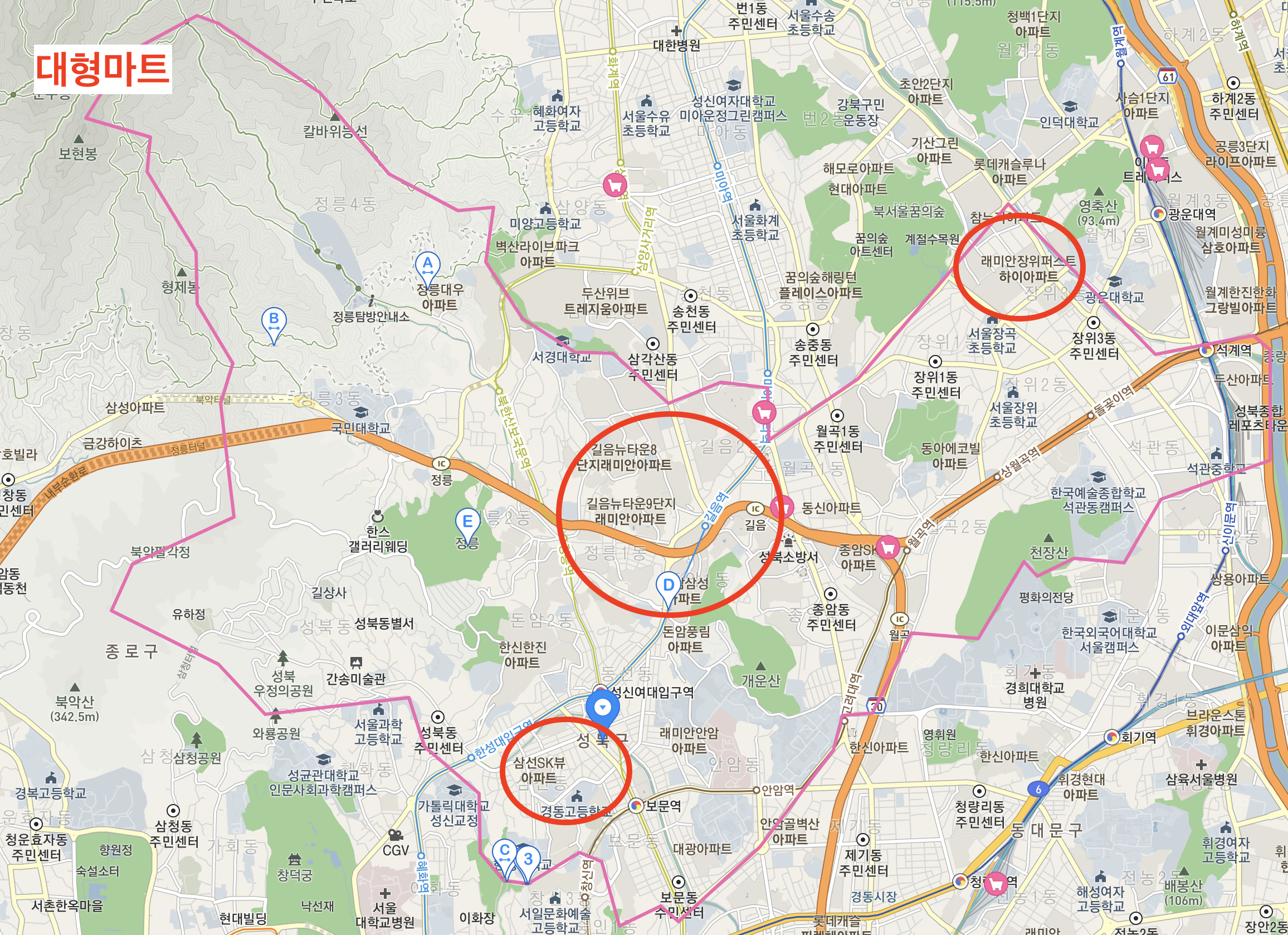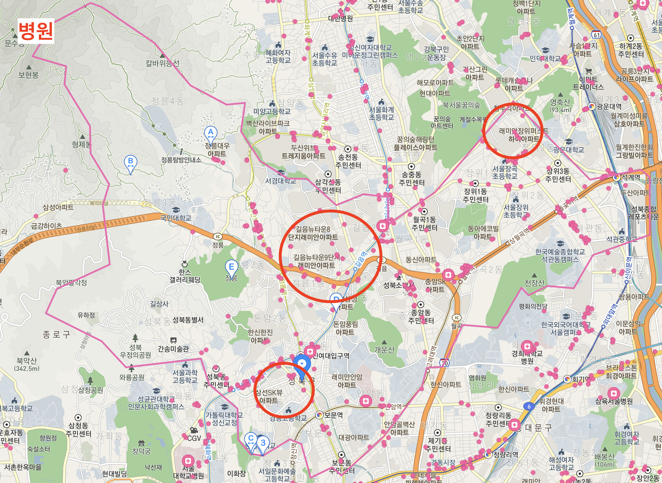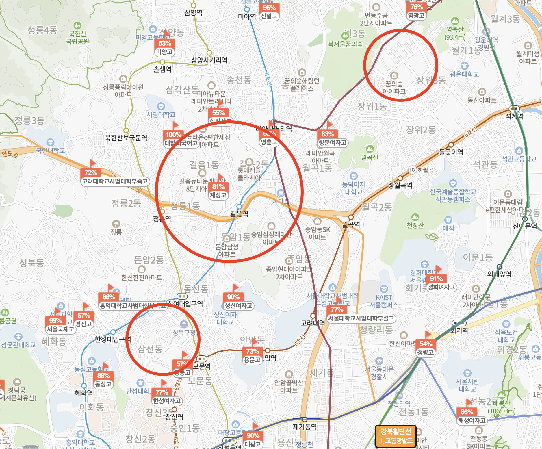 성북구에 대해 분석을 진행하다 보니, 1급지 → 3급지 → 2급지 순으로 입지가 좋은 것 같다는 생각이 들었다. 1, 3급지는 심지어 인근에 2개 노선이 위치해 있고 직통 버스들이 있어서 교통이 매우 유리했으며, 3급지는 대형 상권 및 학원가가 매우 인접하여 자녀를 키우기도 좋을 것 같다. 학업 성취도율도 높은 중, 고등학교 역시 1, 3급지에 몰려있었다는 부분 또한 2급지 입지를 더 안좋게 만드는 부분이다.