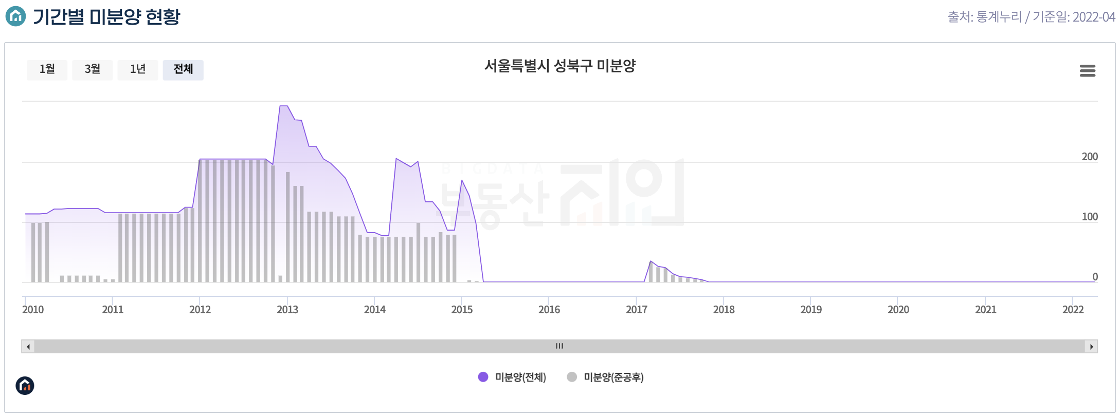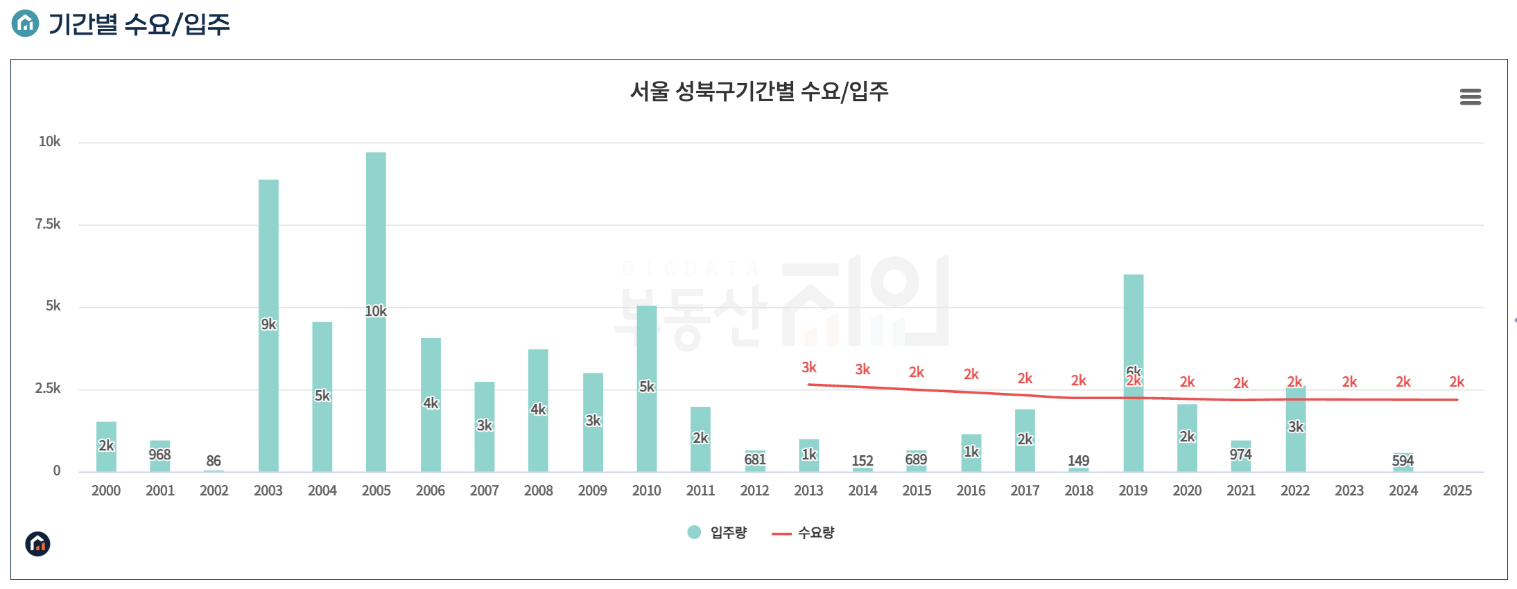 전체 서울의 수요/입주와 대조해보고 성북구 그래프만 살피더라도, 여전히 수요가 훨씬 많다는 것을 알 수 있다.