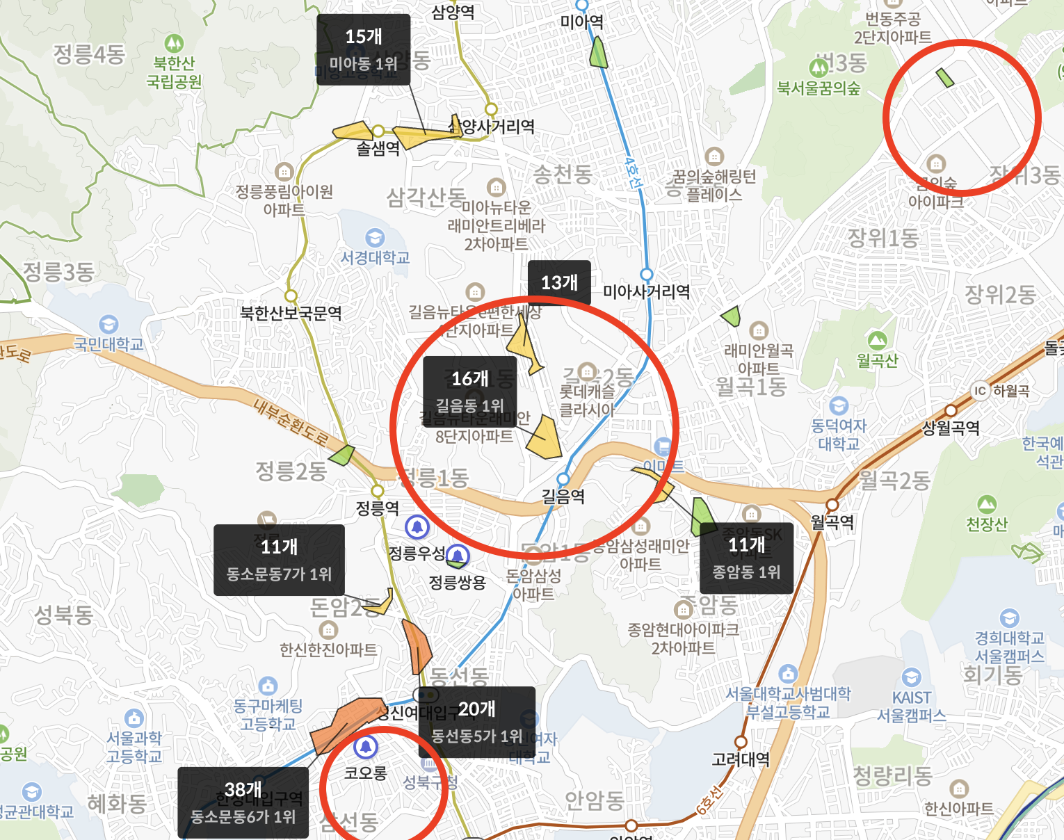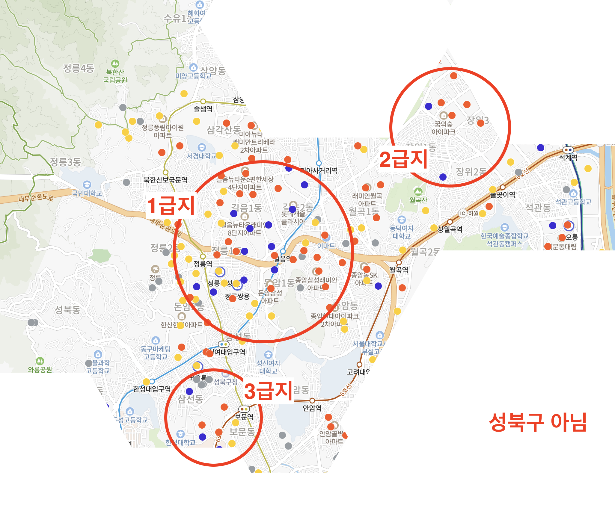 평당가를 보고 급지를 나눠보았다. 1급지는 단연 길음역 인근 지역으로 볼 수 있다. 다만 2, 3급지 선정이 조금 애매하였으나, 대체적으로 평당가가 높고 곧 재개발 될 예정인 곳을 2급지로 선정했다. (관련 기사) 또, 2급지 내 아파트들이 평균 연식이 최근이다.