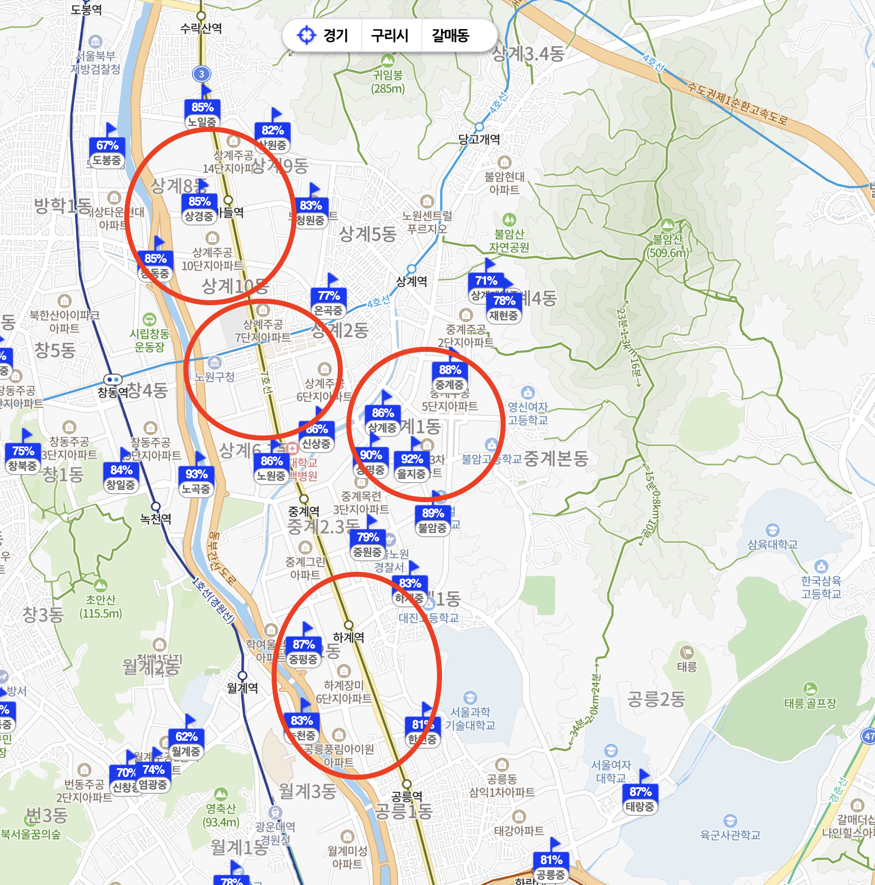 1급지가 왜 평당가가 높은지 이유를 찾았다. 바로 학군이다. 아래 학원가를 보면 알겠지만 해당 지역에 서울에서 2번째로 많은 학원가가 위치해있음을 알 수 있다. 정말 대단하다. 서울 학군 순위를 찾아보니 강남 다음으로 항상 언급될 정도로 인구를 유입시킬 수 있는 큰 요인이다. 다만 학원가 개수에 비해서는 학업성취율이 월등히 높지는 않은 부분이 인상적인 것 같다. 매형이 학원가에서 일하고 있어서 중계 학원가 위상을 물어보니 대치동 다음이라고 했다. 대치동, 목동, 중계가 아주 대단하다고... 아무튼 말할 것 없이 1급지가 가장 우세하고 나머지는 학원가가 거의 불모지 수준이다 보니, 타 급지에서는 다 이 지역으로 학원을 다닐 것 같다는 생각이 든다.