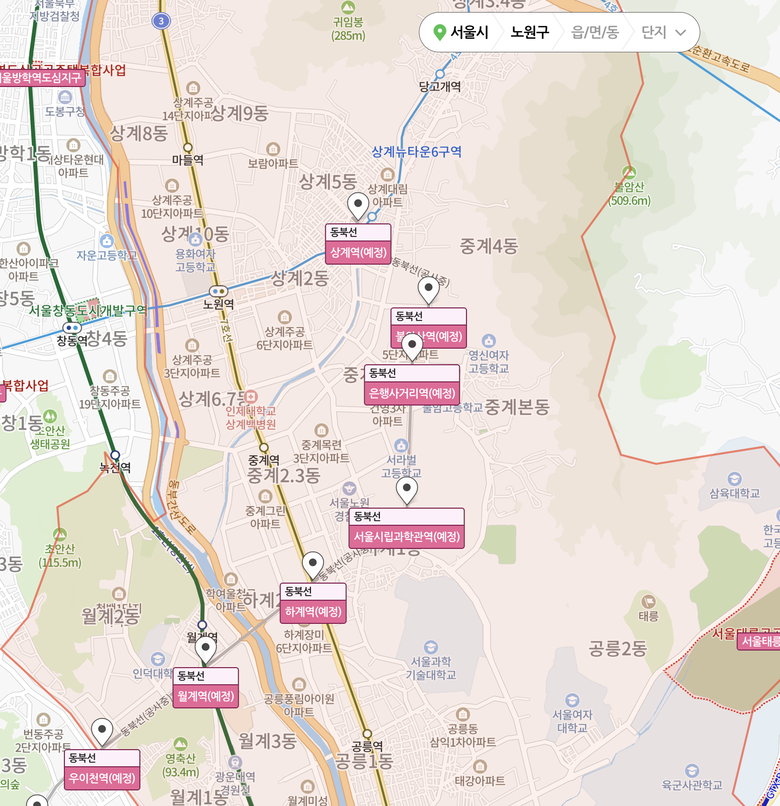 | 구분 | 상계동 | 중계동 | 하계동 | 공릉동 |