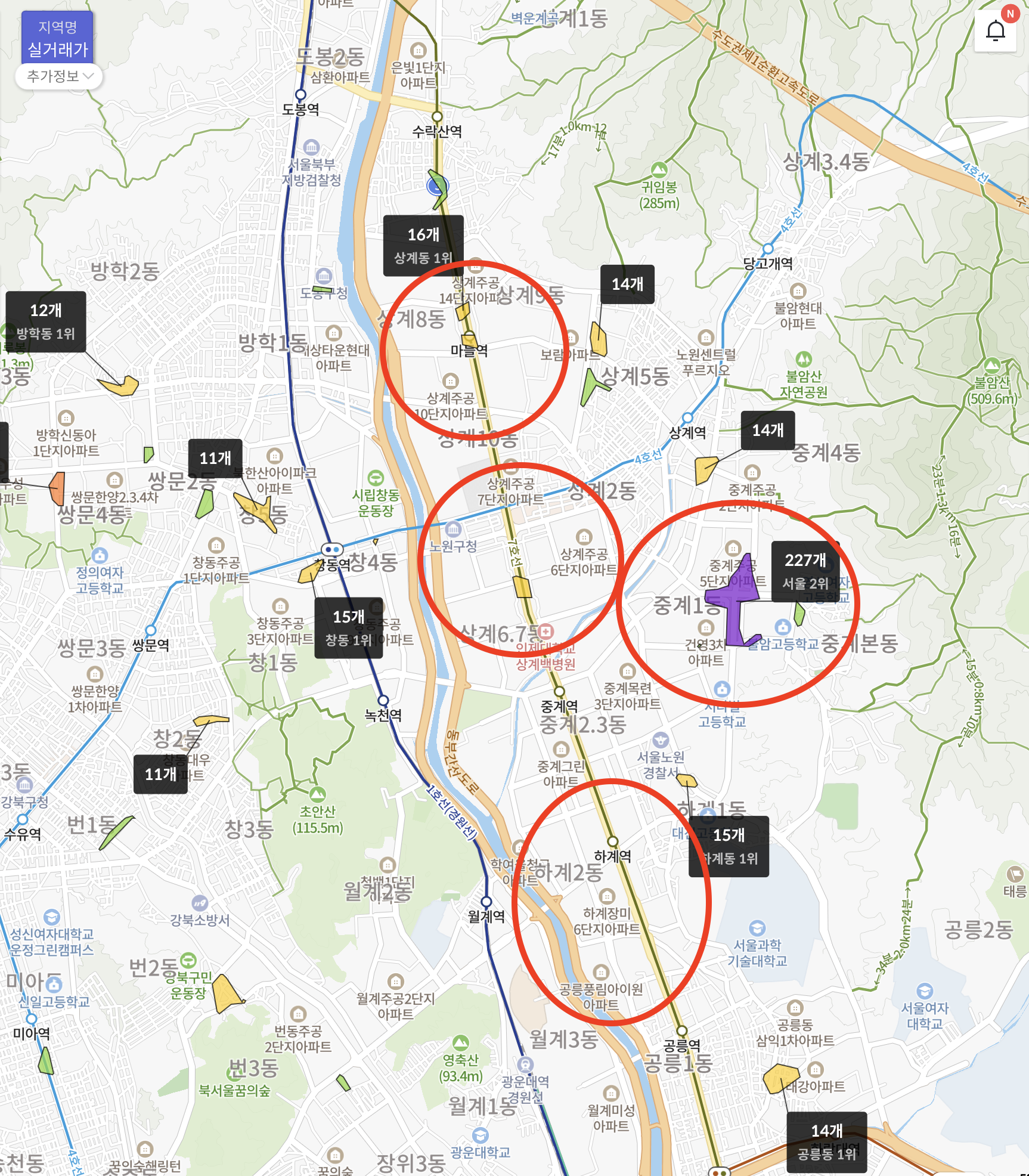 노원역 인근은 예전부터 알짜배기로 잘 사는 사람들이 사는 동네란 인식이 있었는데, 그 사실을 여실히 느낄 수 있었다. 상권이 가장 발달되었고, 지하철 또한 4호선, 7호선, 조금 더 가면 창동에 1호선까지 이용할 수 있다는 장점이 있다. 그리고 이번 분석에서 서울 내 대치동 다음으로 가는 학군인 중계를 발견한 점이 가장 놀라웠고, 노원이라면 해당 지역도 꽤나 지척에 있다는 부분도 장점으로 작용할 수 있겠다. 이런 이유들로 인해 이번 분석에서 가장 매력적으로 느껴졌다. 그 만큼 가격대도 높은 게 불가피한 일인 것 같다.
